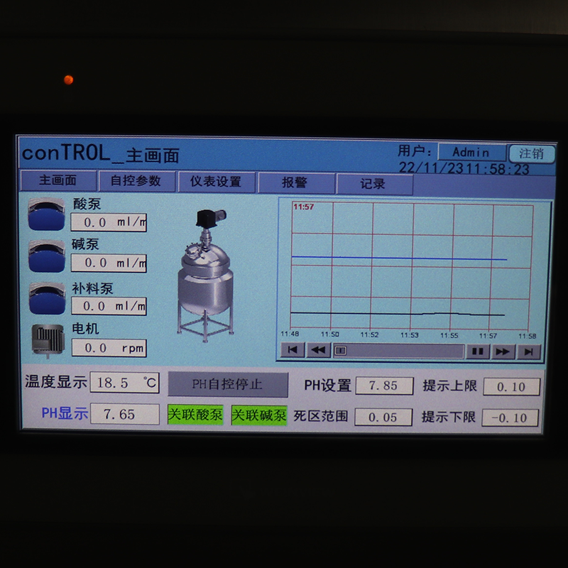 | 自動加料控制系統(tǒng) | 在線PH自動控制系統(tǒng)觸摸屏控制三臺蠕動泵的進料速度,根據(jù)設置的PH值自動補料,數(shù)據(jù)導出有USB接口,導出格式EXCEL | ||||