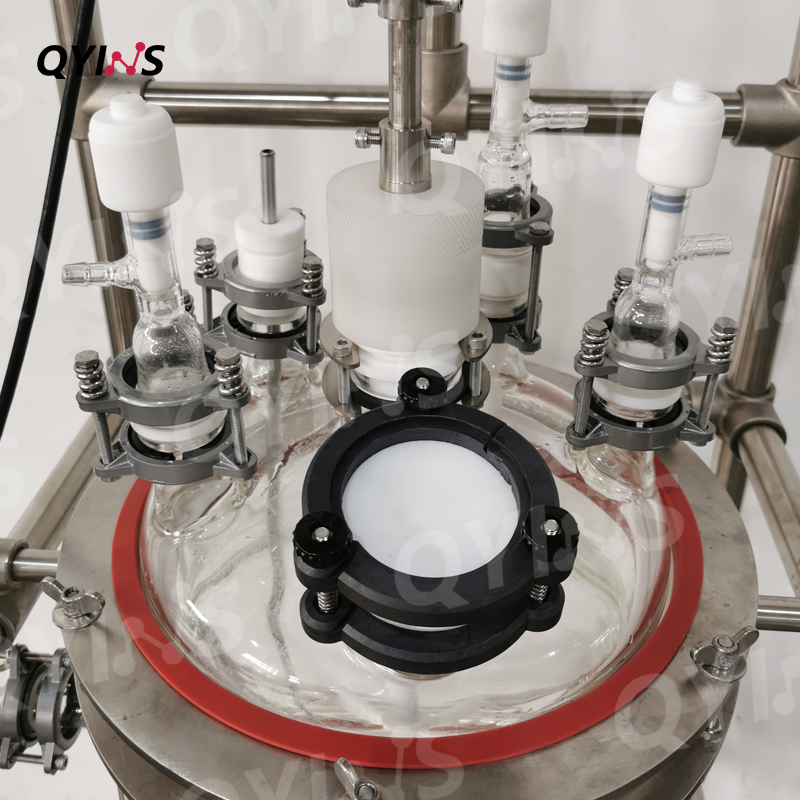 釜蓋開口 共6口( 攪拌口,液體進(jìn)料口,測溫口,固體投料口,放氣口、備用口)可定制
