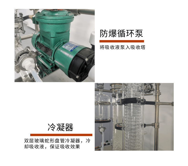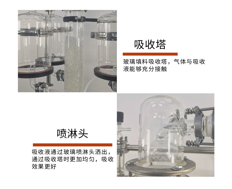 本款防爆尾氣吸收,配備三個防倒吸罐。磁力循環(huán)泵將吸收液從圓底燒瓶打入噴淋頭,從頂部落下。廢氣反方向進(jìn)入吸收柱,兩者充分接觸后,快速達(dá)成凈化。