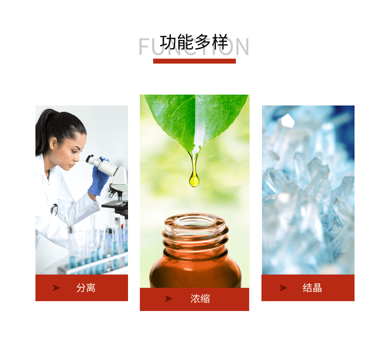 物料從蒸發(fā)器的頂部加入,經(jīng)轉(zhuǎn)子上的料液分布器將其連續(xù)均勻地分布在加熱面上,隨即刮膜器將料液刮成一層極薄、呈湍流狀的液膜,并以螺旋狀向下推進。在此過程中,從加熱面上逸出的輕組分,經(jīng)過很短的路線和幾乎未經(jīng)碰撞就到內(nèi)置冷凝器上冷凝成液,并沿冷凝器管流下,通過位于蒸發(fā)器底部的出料管排出;殘液即重組分在加熱區(qū)下的圓形通道中收集,再通過側(cè)面的出料管中流出。